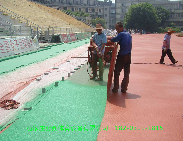2、 不掉粒,面層的EPDM(三元乙丙)膠粒是與聚氨酯漿料、預聚體混合攪拌后,采用機械噴涂進行施工。 透氣型塑膠跑道